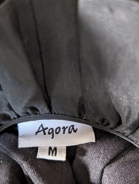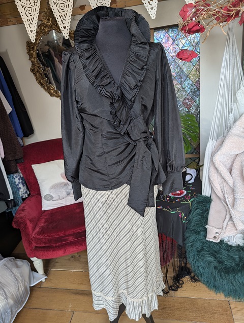 A sculptural staple from Agora, this black blouse features dramatic ruffle detailing along the neckline and front placket, paired with a waist tie that cinches and flatters. The lightweight fabric and sleeveless cut make it ideal for layering or standalone wear, while the fitted waist and flared hem add movement and shape. Worn but in good condition, it’s a versatile piece for boutique wardrobes that value texture, tailoring, and expressive silhouettes.