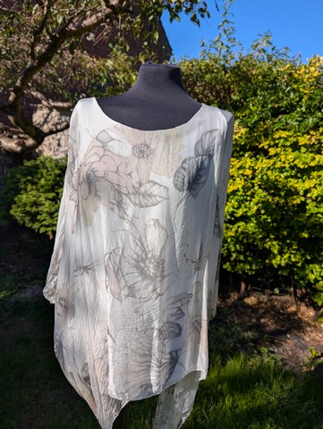 Soft, flowing, and effortlessly elegant, this preloved cream blouse features a delicate floral print in muted tones of grey and blush. The scoop neckline and long sleeves offer a relaxed silhouette, while the asymmetrical hem adds movement and shape. Ideal for layering or standalone wear, it’s a versatile piece that balances comfort with quiet sophistication—perfect for transitional seasons and boutique styling.