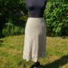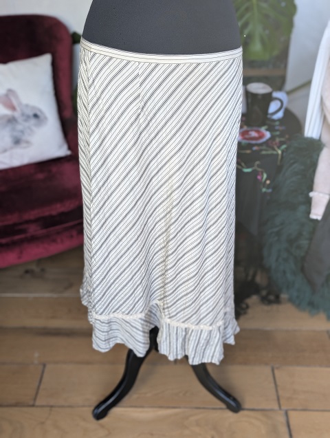 Bold yet playful, this preloved black and white skirt features diagonal stripes that elongate the silhouette and a ruffled hem and detail ribbon that adds movement and charm. The mid-length cut and soft drape make it a versatile piece for both casual and elevated styling. Whether paired with a crisp blouse or layered under a chunky knit, it’s a standout garment that balances graphic edge with feminine detail.