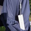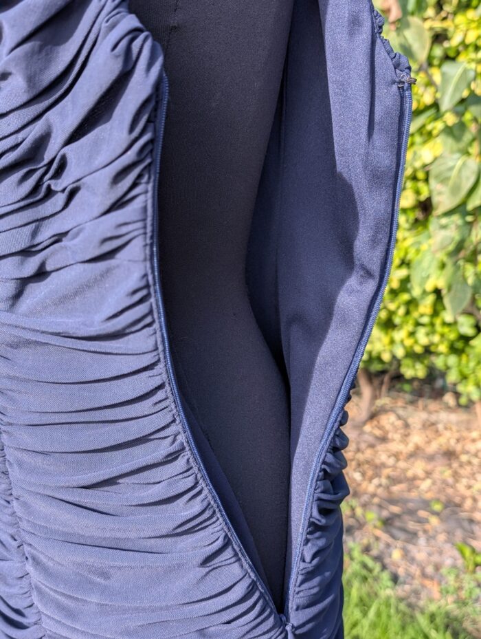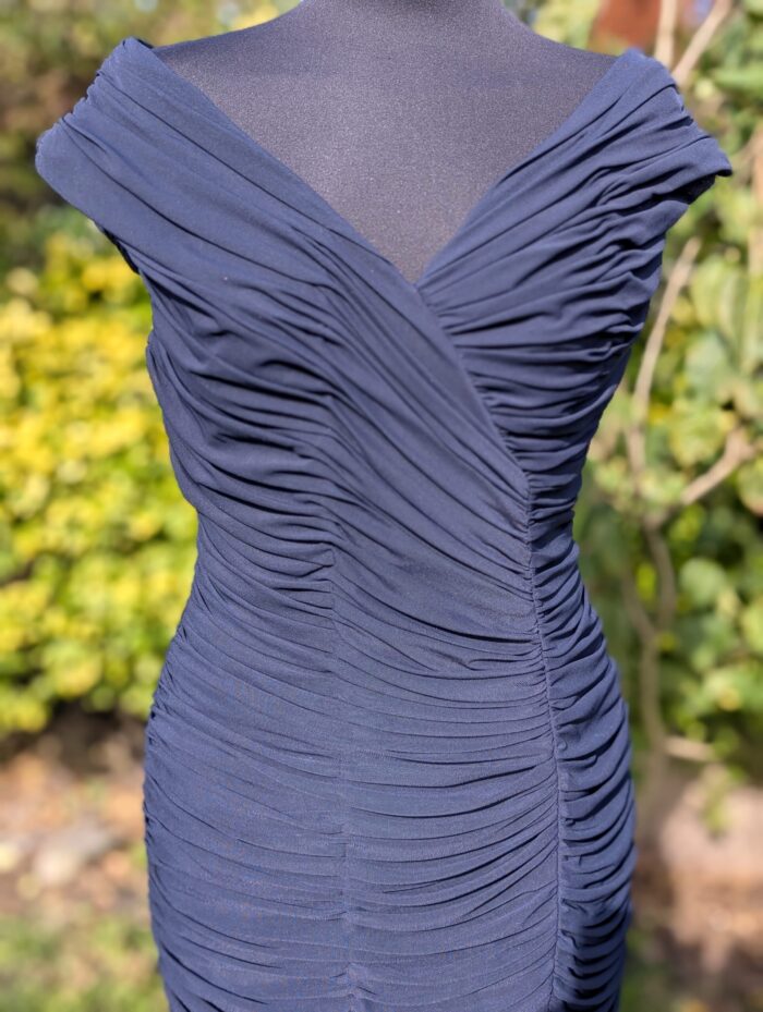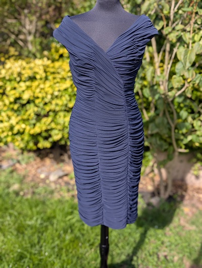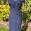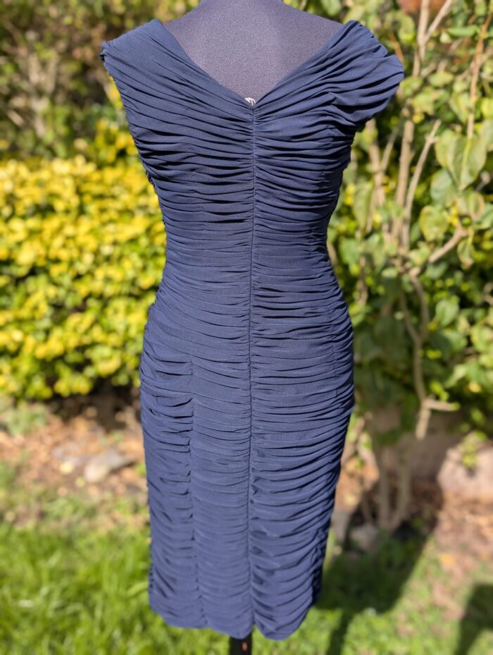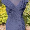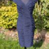 RUSHED DETAIL NAVY V-NECK DRESS.