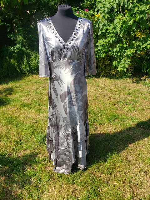 Silver Floral Beaded Dress – V-Neckline with Layered Hem, Size 16 BNWT